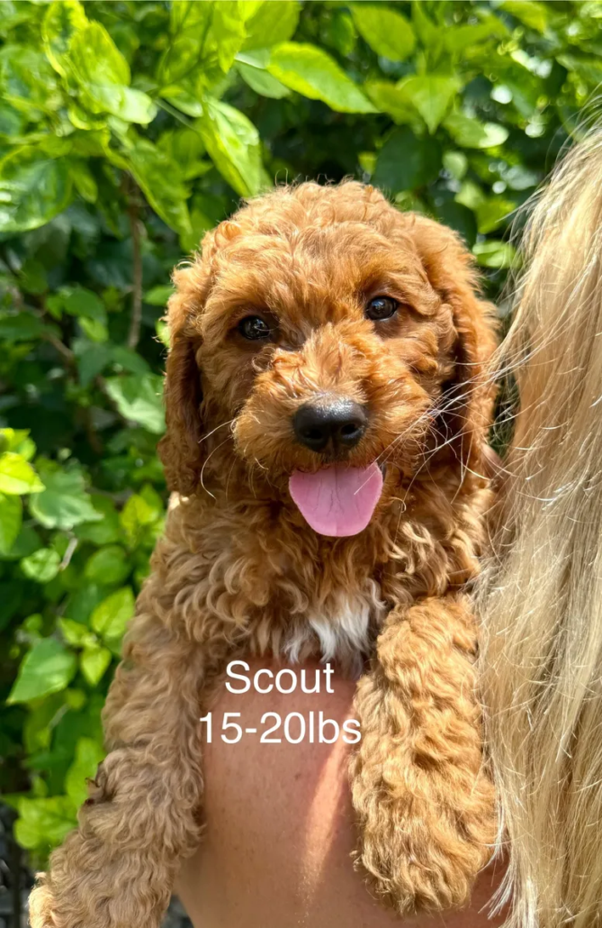 $1000.00 deposit to reserve this awesome mini Goldendoodle male puppy from Designer Golden Doodles! Scout is sweet, spunky and already pee pad training! He does great around other pups and is definitely an alpha among his litter mates. This guy is awesome and just gorgeous! Nice wide head and perfect petite build looking at 15-25 pounds, full grown. Full price 2995.00 This will be deducted from the price of your new puppy. Any questions please call or text or email us! 609-827-2645 or contact us here.
