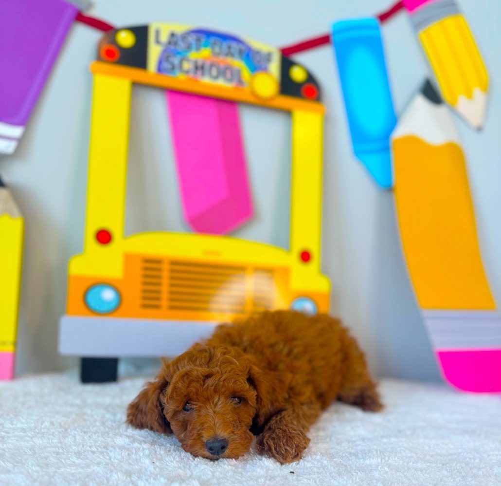 $500.00 Deposit or Pay in full with your Credit Card to reserve this beautiful F1B Micro Mini golden doodle female! “Phoenix” has a great head and build. She will be anywhere from 12-16 lbs. Phoenix as we call her is considered an F1B Micro Mini goldendoodle puppy. This amazing micro mini doodle puppy and will be ready to go home next week! She is priced at $2799.00 and comes with her health cert and first round of shots. Delivery is available. Your credit card will be billed from Designer Golden Doodles! If you have any questions about this pup please call or text or email us! 609-827-2645 or contact us here.