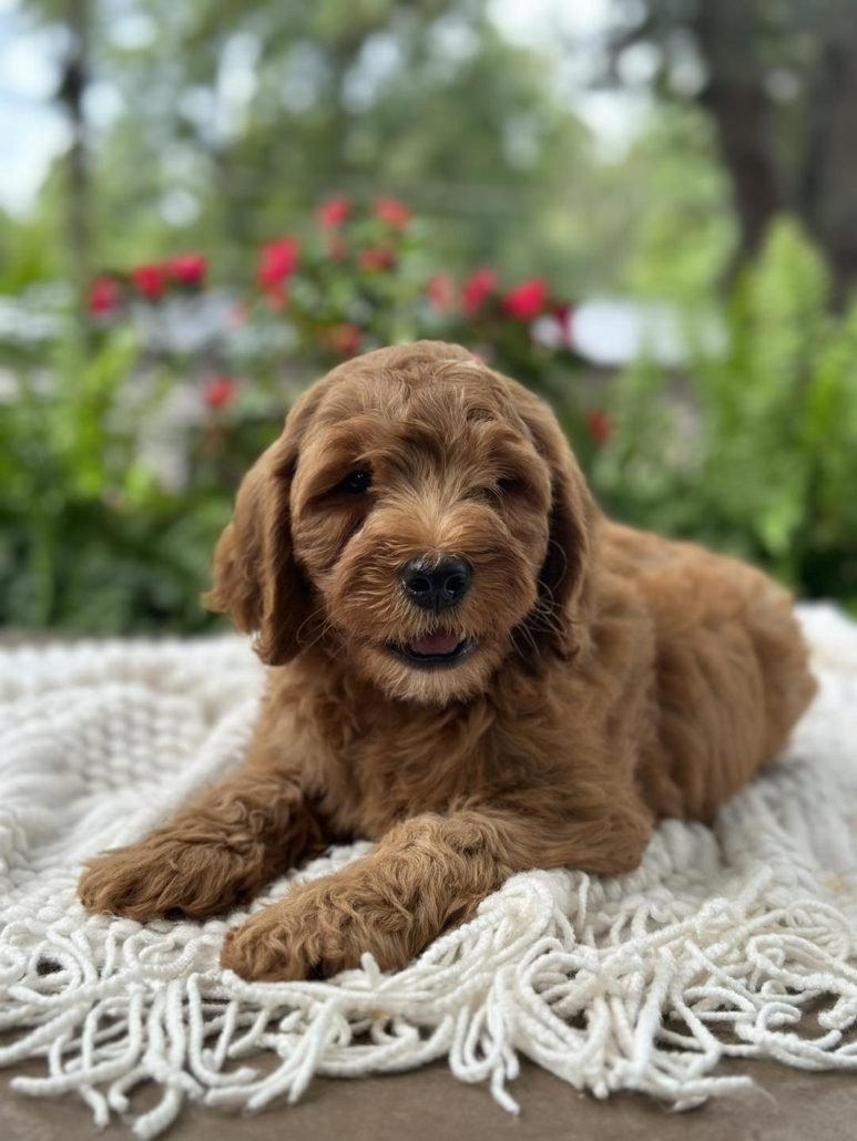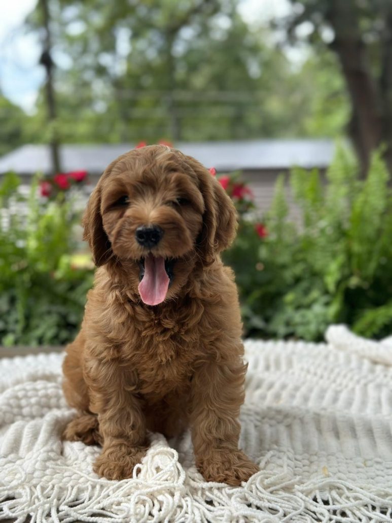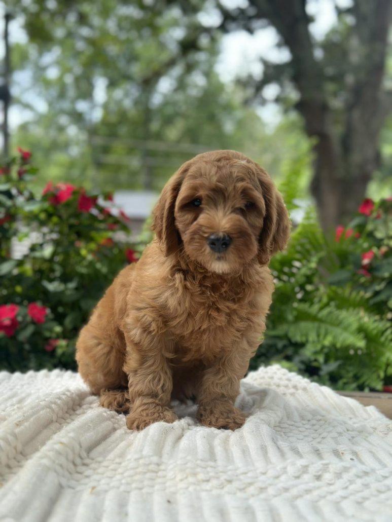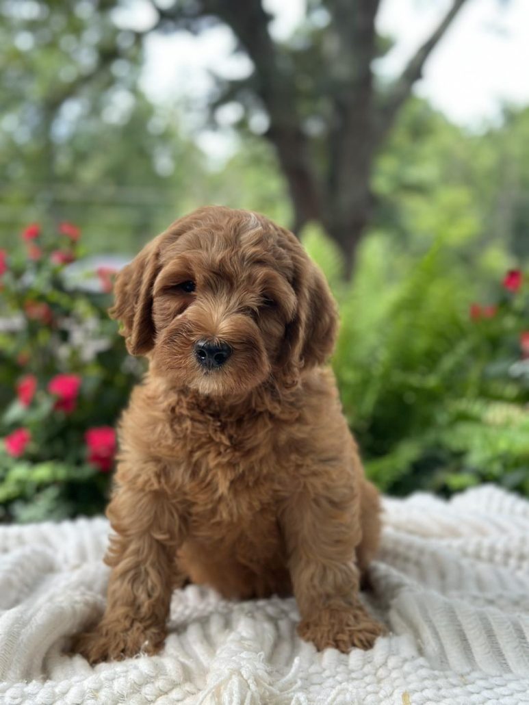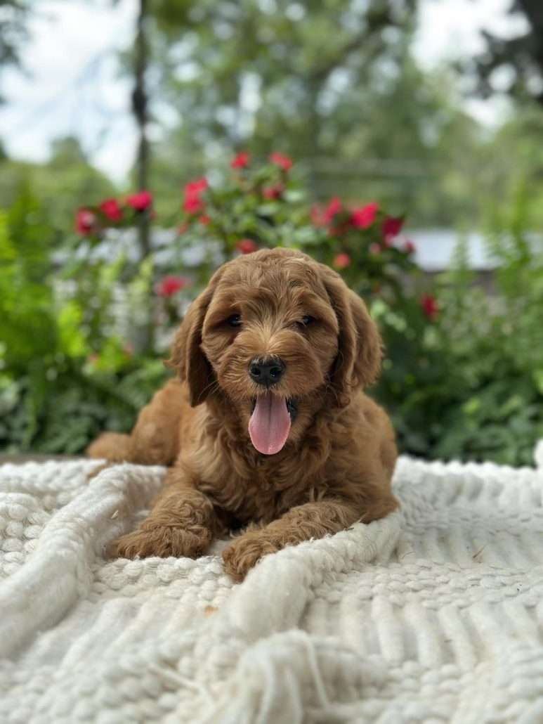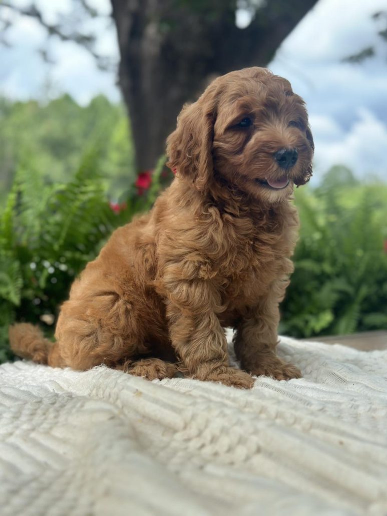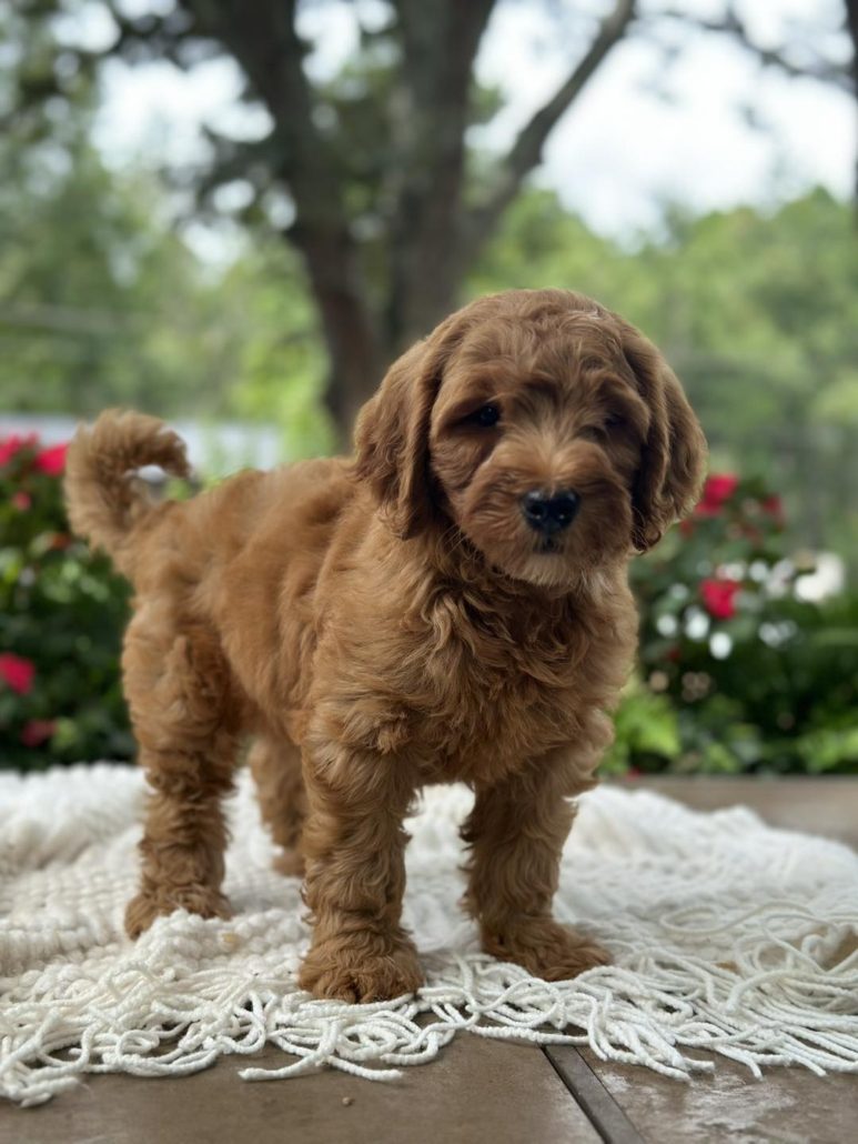 $500.00 Deposit or Pay in full with your Credit Card to reserve this beautiful mini golden doodle boy! Rocky has a great head and build. He is tiny but full of spunk! She will be anywhere from 15-22 pounds. Rocky as we call him is considered a petite mini. This amazing petite mini doodle puppy and will be ready to go home this week! He is priced at $2895 and comes with her health cert and first round of shots. Delivery is available if you are unable to pick him up. We also offer financing through our partner Terrace Finance, to explore financing options, please click here. If you have any questions about this pup please call or text or email us! 609-827-2645 or contact us here.